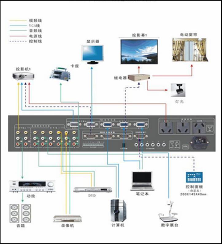 随着科技的发展,我们已经进入了一个高速发展的信息时代。以计算机技术为核心的多媒体以及通信技术被广泛应用于各种领域。多媒体电化教学、网络教学、远程教学等已在全国各地悄然兴起。多媒体中央控制系统利用计算机及微电脑技术对多媒体电教室、会议室中的各种设备进行集中控制、管理,以简单明了的按键方式提供给用户使用,将复杂的控制转化为简单的按键操作,真正实现"所见即所控"。